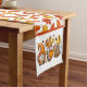 A Thanksgiving Table Runner Of Orange and Yellow Fall Leaves And Three Little Thanksgiving Gnomes