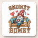 This charming design depicts a cozy scene featuring a gnome and a cat on a couch. Above the gnome, the word "GNOMEY" is prominently displayed in large, bold, brown block letters. Below the gnome, the word "HOMEY" is written in the same distinctive style, reinforcing the cozy and domestic atmosphere. Adding to the heart warming theme, red hearts are scattered throughout the design, symbolizing love and affection.
