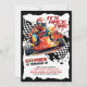 Trendy, modern Go Kart birthday party invitation. Design features typography script ''It's Race Time'' in red lettering , colourful go kart rider illustration, and chequered flag pattern on a white background. Personalise with a name, age and party details in trendy capital lettering. Suitable for any age.