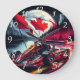 A striking Go kart hot rod speeds along a winding path, the Canadian flag waving proudly as it races against a backdrop of a glowing full moon and dark pine trees.