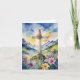 watercolor portrait of a cross sitting in between mountains, surrounded my flowers.