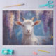 A charming painting featuring a goat portrait framed below cascading purple wisteria flowers, blending rustic personality with floral elegance.