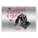 CUSTOMIZE THIS Christmas Card- Adorable Portrait painting of a Nubian baby goat with Christmas greenery, holly and berries, a red bow and mistletoe - with ornate calligraphy text that reads: Christmas Wishes and Baby Goat Kisses all on a removable silver background - remove background to reveal white or choose any colour background you like from the customise colour picker - Perfect for the goat lover in the family - won't they be surprised to see this unique Original Christmas goat Christmas Card in their mailbox. A ©goatlady GetYerGoat™ original.