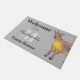 A fun colourful baby goat welcome family name custom doormat with modern typography and easy personalise with your family name. Cute goat colourful farm animal in bright colours on a grey background with grey and black modern script typography. Ideal for farm animal lovers and celebrates the craziness of farm animal life. Adorable multicolored goat original artwork by artist Catherine Sweetman