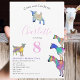 A collection of colourful watercolor goat illustrations in vibrant pink, purple, blue, orange, yellow and aqua. A cute farm animals 8th birthday party invitation with baby goats and goats standing on goats. This fun party invitation is easy to personalised to create a unique party invitation suitable for children and adult goat lovers. Colourful pink themed psychedelic goat original illustrations by artist Catherine Sweetman