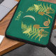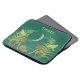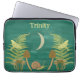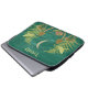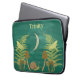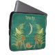 My illustrations depict a natural world with some dark undertones. A crescent moon hangs in the sky above a scene of green ferns, yellow moths, brown mushrooms and a green and brown snail all set against a painted dark teal coloured background. This laptop sleeve is ready to be personalised with a name or other text in yellow lettering.