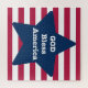 Red and white horizontal pin stripes with a big blue star and the white lettering phrase inside.