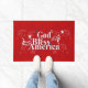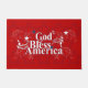 God Bless America adorns this patriotic door mat with white stars on a bright red background.