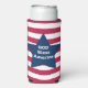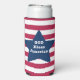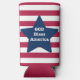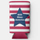 Seltzer Can Cooler Koozie Sleeve printed with God Bless America Red White And Blue lettering and stripes artwork design by TheFabricSeal at Zazzle.com #ZazzleMade TheFabricSeal©️Original.