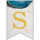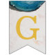 A bunting banner for religious events, recommended for boys, with white marble background, golden letters and crosses between words and blue geode agates on the upper borders. The text of the banner says "God Bless [Name]" where the name has 6 letters - the default is Oliver.