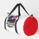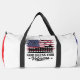 This white duffle bag features a patriotic design with an American flag, silhouettes of saluting soldiers, fighter jets, and a naval ship, with the text "GOD BLESS OUR Veterans." This design is perfect for showing respect and gratitude for military veterans. Edit colour of the bag caps and body in the Design tool to your favored colours.