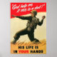 This vintage war poster features an American Soldier tossing a grenade at the enemy. It declares, "God help me if this is a dud! -- His life is in your hands". Celebrate American and WW2 History with this digitally restored vintage war poster product.