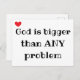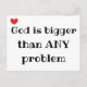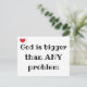 This is a cute Christian faith postcard that says 'God is bigger than ANY problem' printed in cute black letters. A cute red heart print can also be seen above the word 'God'. Perfect to send anyone who is facing a difficult problem in their lives...