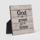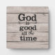Inspirational decoration plaque with easel - "God is good all the time" typography on a faux wood background.
