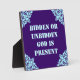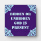 Corner light blue scrolls on a indigo background with the quote "Bidden or Unbidden God is Present"