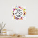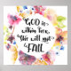 Typography design with caption in elegant black calligraphy letters, "God is Within Her She Will Not Fail.” Design is centred inside colourful watercolor floral wreath. Bible verse is from Jesus' words in from Psalm 46:5.