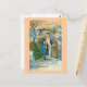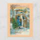 Delightful Swedish Christmas card showing Santa Claus arriving at a garden gate with a big sack of gifts and toys.