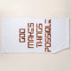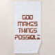 This beach towel showcases the words “God Makes Things Possible” in a unique space age print font with black letters orange outline in this dual colour faith based style and theme. The front of this towel is a polyester blend, the back is 100% cotton with vibrant sublimation printing that is designed to last. Enjoy this towel for your next picnic, beach getaway or any outdoor activity you may attend all towels are machine washable with recommended low speed tumble dry.