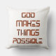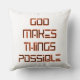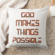 This throw pillow showcases the words “God Makes Things Possible” in a unique space age print font with black letters orange outline in this dual colour faith based style and theme. This pillow is made with high quality simplex knit fabric our pillows are soft and wrinkle-free the cover is machine washable.