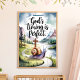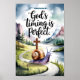 A watercolor illustration of a snail with a tiny cross on its shell. The snail is moving along a winding path. Above the snail, there is a text that says "God’s Timing is Perfect." The background is a serene landscape with mountains, trees, and a body of water.
