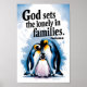 A watercolor illustration of a penguin family huddled together. The background contains the phrase "God Sets the Lonely in Families." in a vintage font.