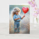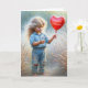 Cute little girl wearing ripped denim jeans and holding a red heart balloon in a country field for a godddaughter.