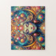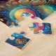 Relaxing Puzzle - Goddess Head sunny Hair closed eyes Portrait - Month of July Vibes - This beautiful ai style Design shows a Head of a beautiful Woman with closed relaxed eyes and decorative shiny sun jewellery crown in her blonde teal flowing hair, dwelling in a divine celestial Universe. The main colours in this art piece are gold orange yellow, teal turquoise blue.