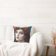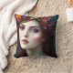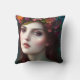 Beautiful throw pillow features a stunning AI generated image of the Goddess of Love, Aphrodite or Venus in a fine art portrait style with rich colours and a lush floral crown.