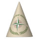 Party hat design features an original marker illustration of a camping and hiking compass. Ideal for a retirement party or going away party, or celebrating anyone going in new directions.