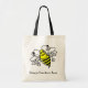 A cute cartoon bee sits on this tote bag. This can be used as an overnight bag, for books, a diaper bag, or anything else you can think of. All text is customisable.