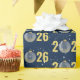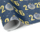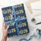 Gold 2025 text with Christmas ornament on blue with snowflakes.