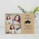 Modern 2-sided gold/tan 4-photo graduation flat card with text, "Save the date". Personalised with your name in an elegant script font, school name, graduation year, graduation date, time, and location, along with a message telling friends and family that a formal invitation will follow. Add 3 photos on the front and 1 on the back.