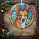 Here's a pretty glass ornament with a stained glass theme, featuring a beautiful Basenji dog. The dog is bright gold and white, and set against a predominantly blue abstract background with a multi colour border. This makes a nice stocking stuffer or decoration for the household who loves a Basenji.