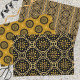 Set of three wrapping paper sheets with different patterns. Each sheet features a seamless pattern made of geometric shapes in faux gold and black.