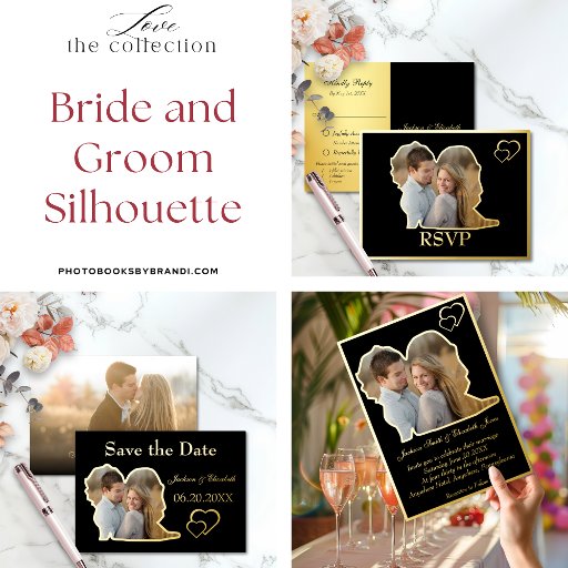 Announce your wedding with a sleek, gold, modern wedding save the date that features one photo in the shape of a bride and groom silhouette on the front and another full page photo on the back. With elegant gold font on a modern black background, it’s easy to customise. All text and colours are editable. If you need assistance with the design or matching products, please email Brandi@photobooksbybrandi.com