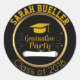 Modern gold and black Class of 2018 graduation party stickers- Black circular frame with faux metallic, gold rim displays faux foil, gold graduation cap with diploma/degree. Reads 'Graduation Party' with scattered stars that look like shiny, matching gold foil. Personalised with graduate's name in matching gold colour, retro style letters at the top and curved 'Class of 2018' below in matching gold. (Class year may be changed.) Chic, modern graduation design to go with any gold graduation party theme or decor. We have coordinating black and gold graduation party invitations, as well as other modern graduation party supplies and personalised party themes in our Zazzle.com/angela65* shop. Simple, chic personalised graduation party style for gold graduation party envelope seals, black and gold school colours, or black graduation party favours. Click Customise option to change text colours, size, and font styles.