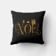 This very contemporary black and gold Christmas throw pillow will be sure to add a modern, elegant touch to your Christmas decor for the home this holiday season. The design features a large, golden sign, the traditional festive greeting of 'Noel'. The fancy gold lettering features little designer elements such as golden candy cane, gold stars and snowflakes, little gold gift boxes, and a santa hat.