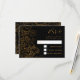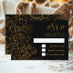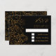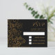This elegant wedding rsvp features a delicate floral ornamental design with flowers, birds and leaves on a gold and black background. The text combines handwritten script and serif fonts for a stylish and modern look.