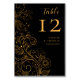 This elegant table number wedding sign features a delicate floral ornamental design with flowers, birds and leaves on a gold and black background. The text combines handwritten script and serif fonts for a stylish and modern look. Perfect for a winter or autumn fall wedding.