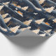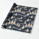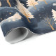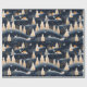 This wrapping paper features a serene winter landscape—dusty blue snow blanketing the earth, glowing white pine trees stretching towards a twilight sky, charming gold houses twinkling with the promise of warmth, and a lone white dog meandering through the scene as if on a magical journey.