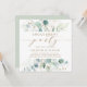 This engagement party square invitation features painted watercolor eucalyptus, botanical green and gold glitter leaves with gold script.