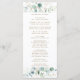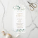 This wedding program features painted watercolor eucalyptus, botanical green and gold glitter leaves with gold script.