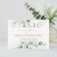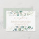 This wedding reception enclosure card features painted watercolor eucalyptus, botanical green and gold glitter leaves with gold script.