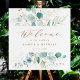 This wedding welcome sign features painted watercolor eucalyptus, botanical green and gold glitter leaves with gold script.