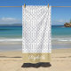 This custom made-to-order beach towel has a preppy trellis pattern in gold, light grey and white. Personalise it with your name monogram or other custom text in a modern script font. Use the design tools to choose any background colours, edit the text fonts and colours or upload your own photos to create a custom monogrammed beach towel.