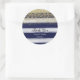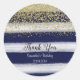 Round sticker for birthday favour with gold glitter design and navy blue stripes background.