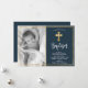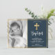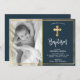 Simple, elegant Gold and Navy Blue christening and baptism Invitation. Send to family and friends with this modern personalised religious flat card. It features hand lettered ”Baptism” script, around double faux gold foil frame on grey background. This modern simple photo thank you card will also be perfect for baptism / christening / naming ceremony / confirmation and holy communion thank you card for boy or girl. #3354