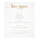 The design is both stylish and practical, with sections for wines, beers, spirits, and non-alcoholic drinks. The text is presented in a mix of print and fancy script, giving the menu a classic yet modern look. The "bar menu" header is prominently displayed in the fancy script, adding a decorative element to the design.