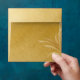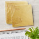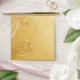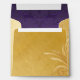 Elegant golden look square white wedding invitation envelope, with graphics of a gold flourish. The inside is done in a rich purple damask pattern. Personalise the black return address, on the back flap of the envelope, for your special day. Matching Gold with Peacock wedding invitations and products are available.