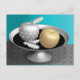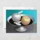Gold and silver Christmas apples on a silver pedestal on a silver lace tablecloth with a turquoise silk background